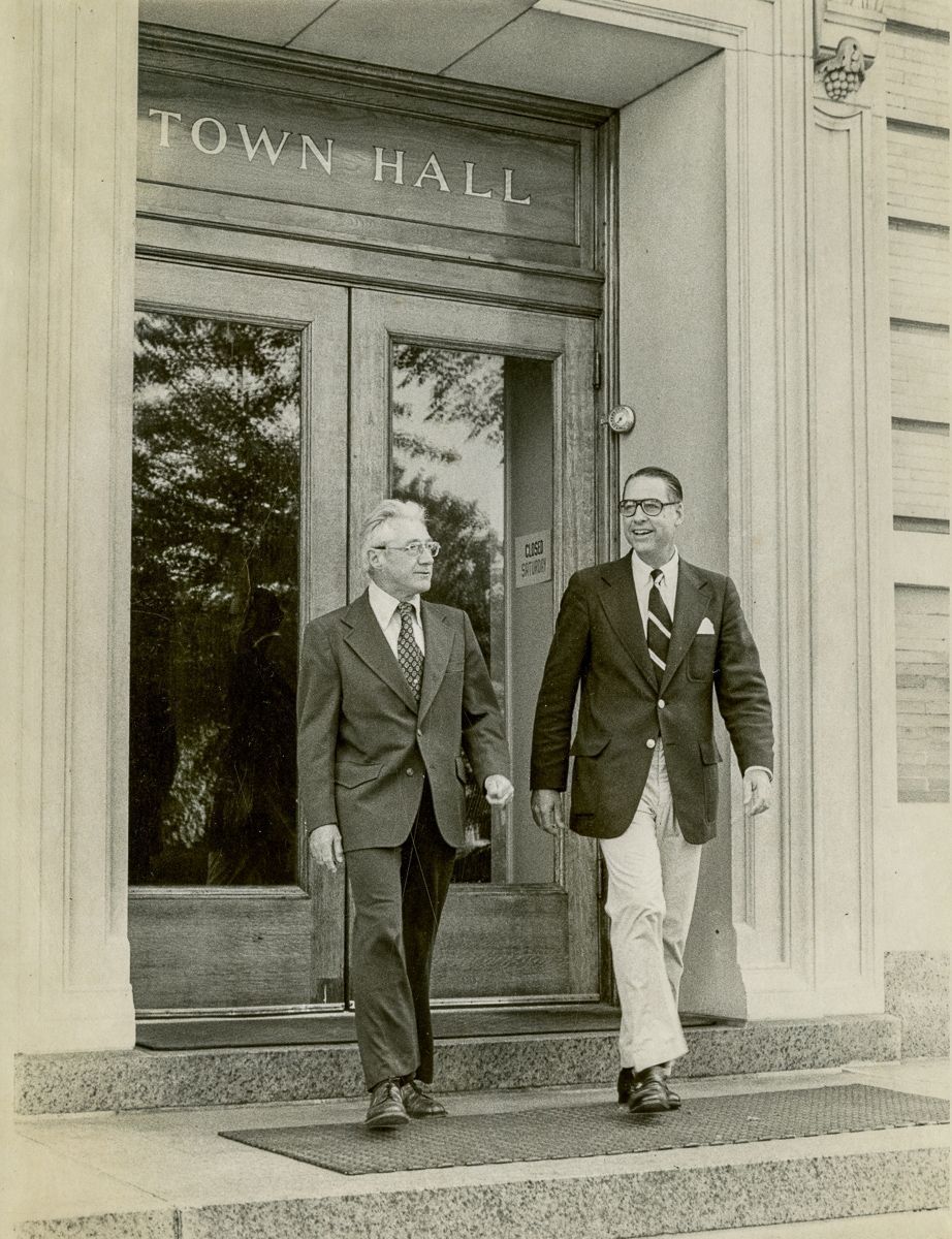 Ruppert Vernon, First Selectman of Greenwich, and another man on the steps of Town Hall.