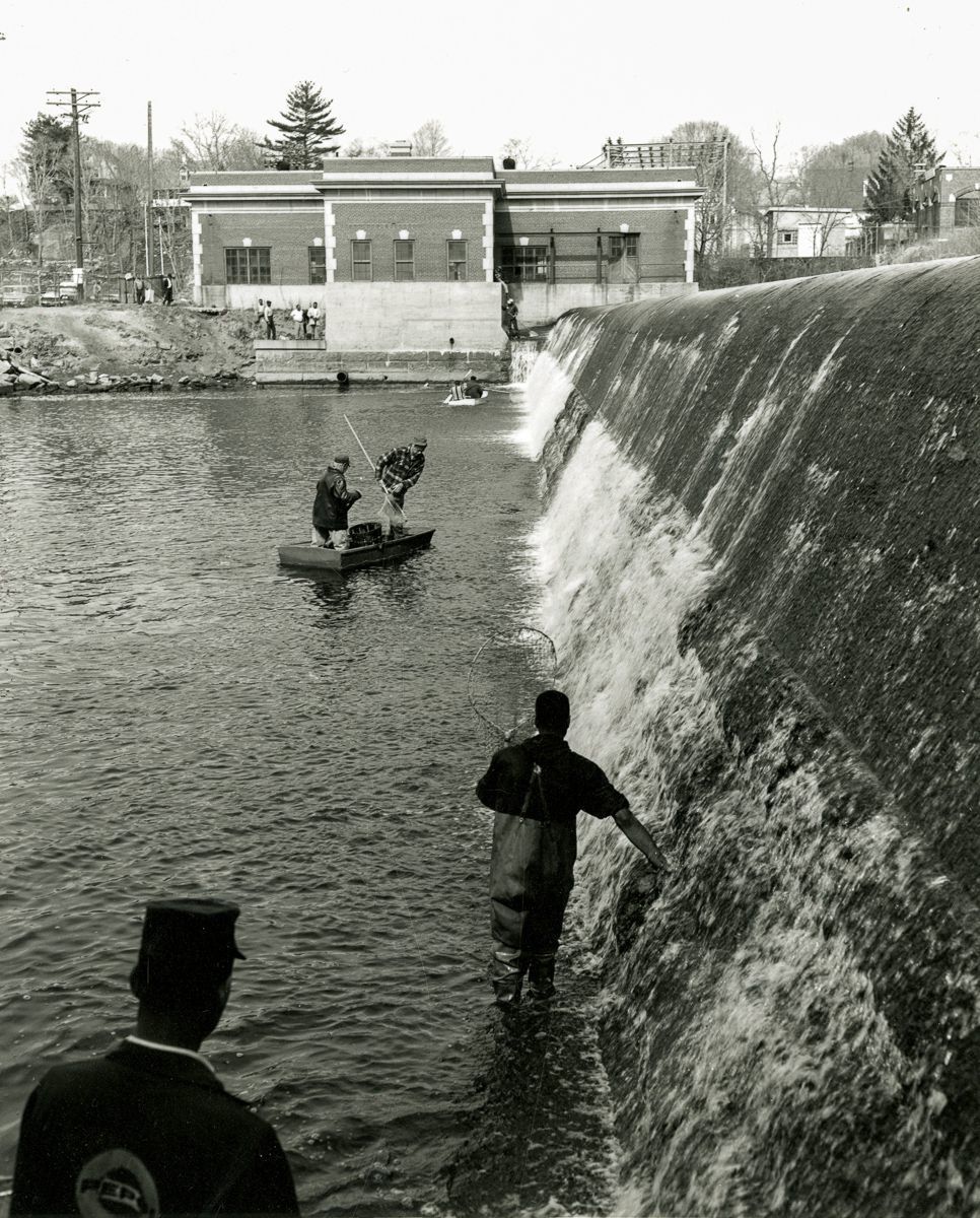 Three views of the Mianus River Dam, looking north, including two of men using nets to fish at the base of the dam.Collection