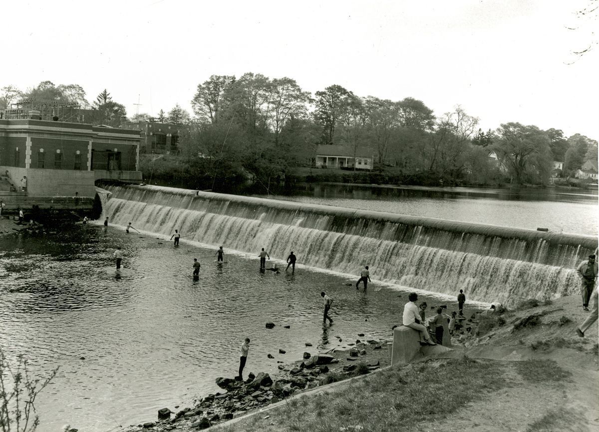 Three views of the Mianus River Dam, looking north, including two of men using nets to fish at the base of the dam.Collection