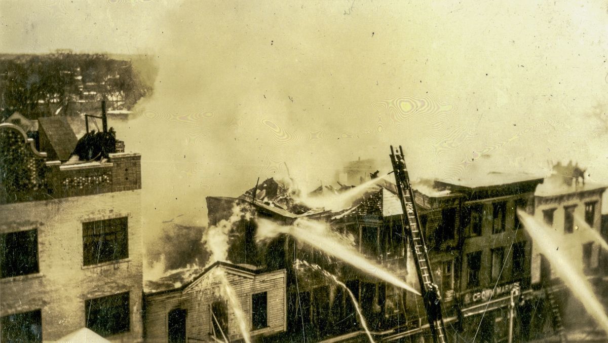 Images of a firefighter's combating a fire on Greenwich Avenue as well as the crowds of onlookers watching them on February 22nd, 1936.Collection