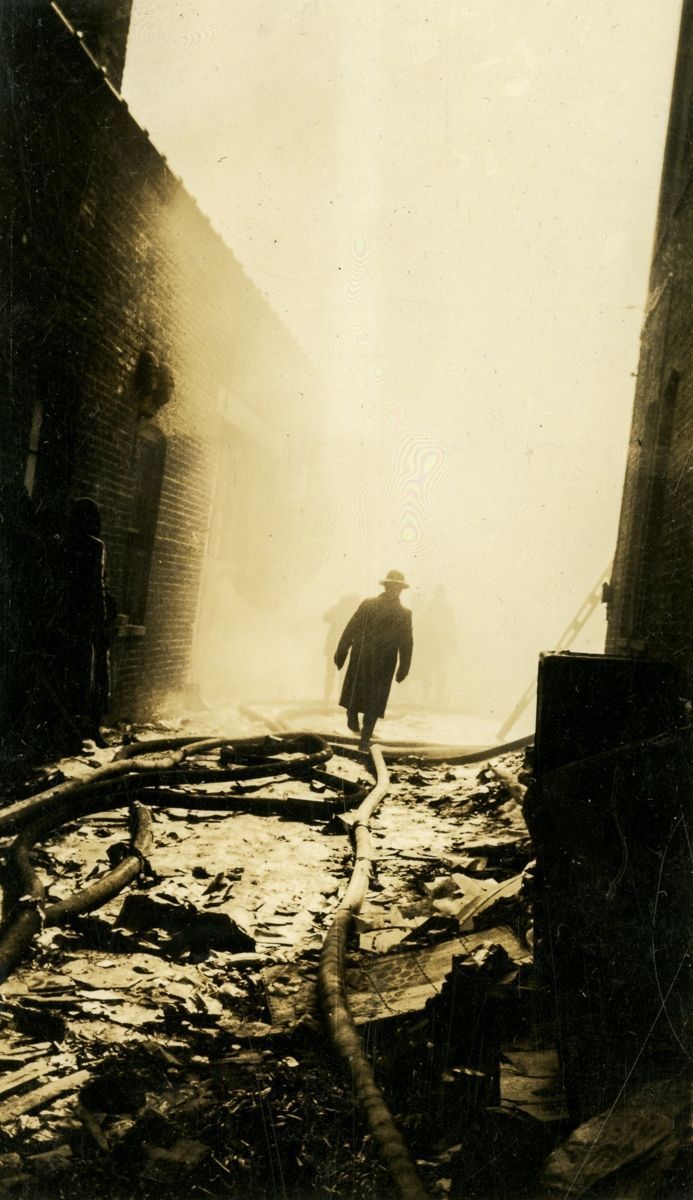 Images of a firefighter's combating a fire on Greenwich Avenue as well as the crowds of onlookers watching them on February 22nd, 1936.Collection