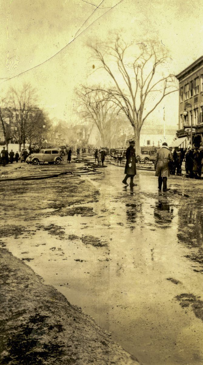 Images of a firefighter's combating a fire on Greenwich Avenue as well as the crowds of onlookers watching them on February 22nd, 1936.Collection