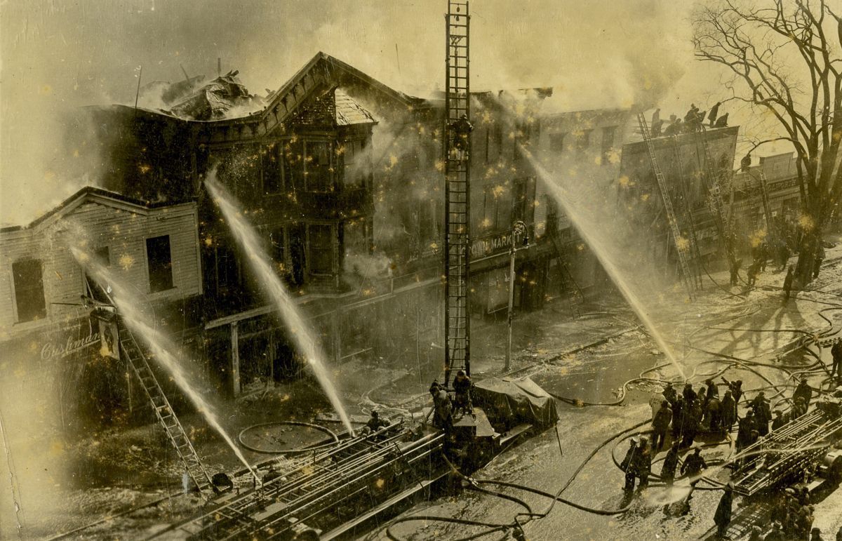 Images of a firefighter's combating a fire on Greenwich Avenue as well as the crowds of onlookers watching them on February 22nd, 1936.Collection