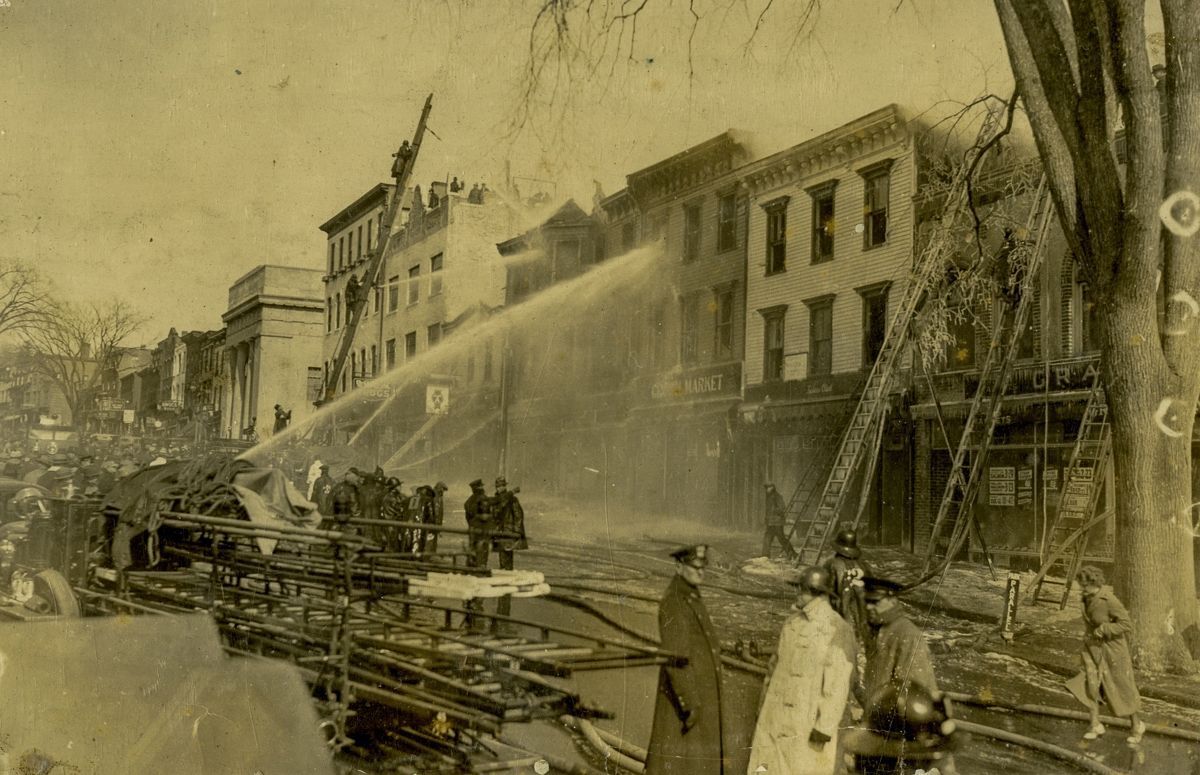 Images of a firefighter's combating a fire on Greenwich Avenue as well as the crowds of onlookers watching them on February 22nd, 1936.Collection