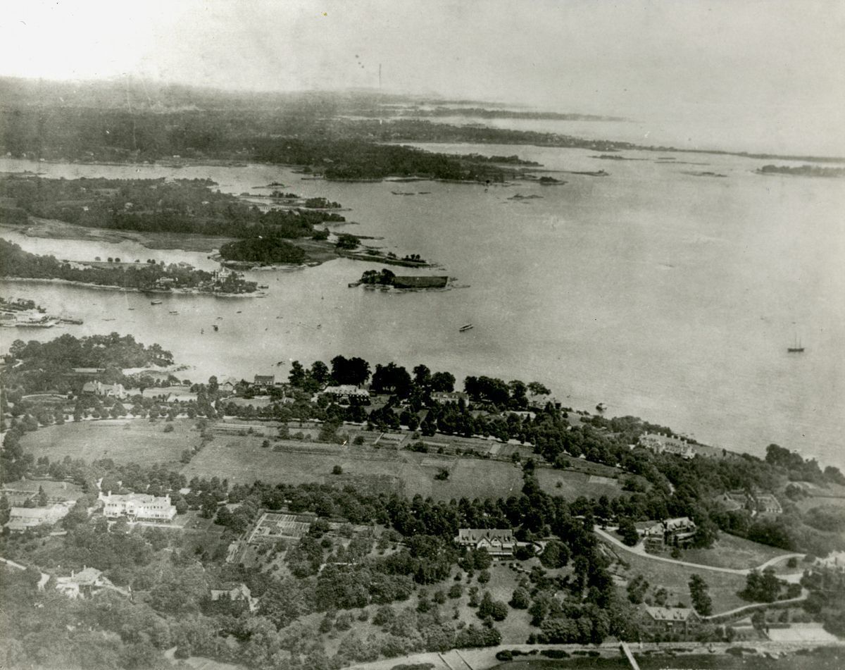 Aerial view looking east from over Field Point Circle towards Greenwich Point.