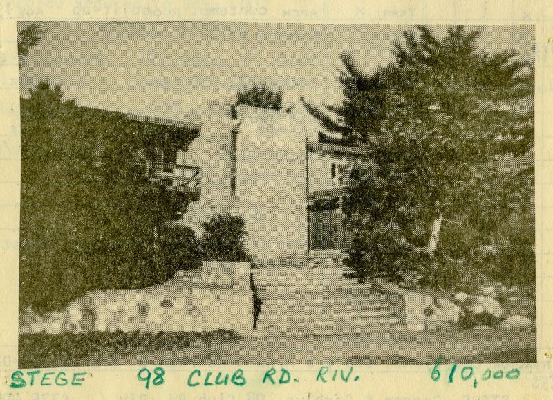 Contemporary house built in 1963 with brick and redwood exteriors viewed from its lawn.