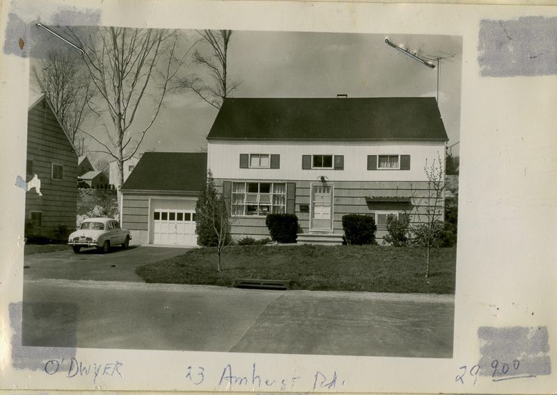 Small two story house built in 1960 with an attached garage and a car parked in its driveway viewed from the street.Collection