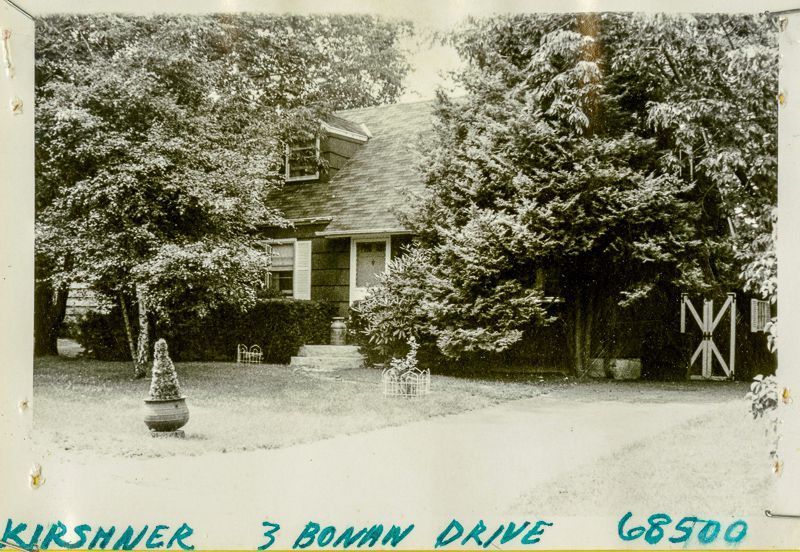Cape Cod house built in 1952 partially obscured by trees on the property viewed from the street.