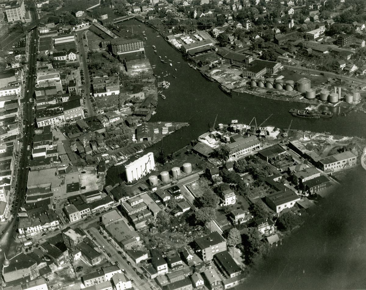 Aerial view looking north up the Byram River with Main Street, Port Chester on the far left and South Water Street, Greenwich in the upper right of the image.Collection