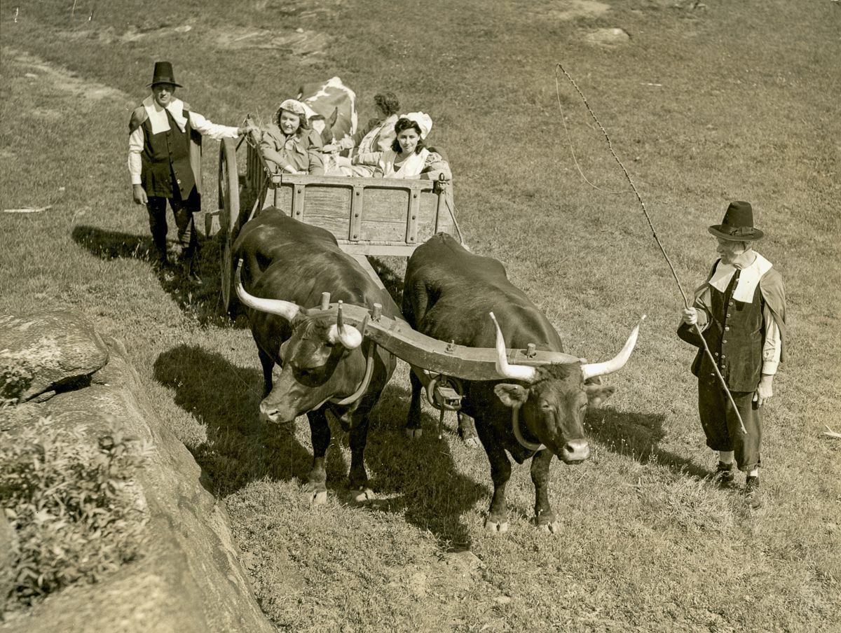 A group of women in Colonial-era costume taking a ride in an ox-cart as part of a "Patriotic pageant" celebrating the 300th Anniversary of Greenwich's Founding.Collection