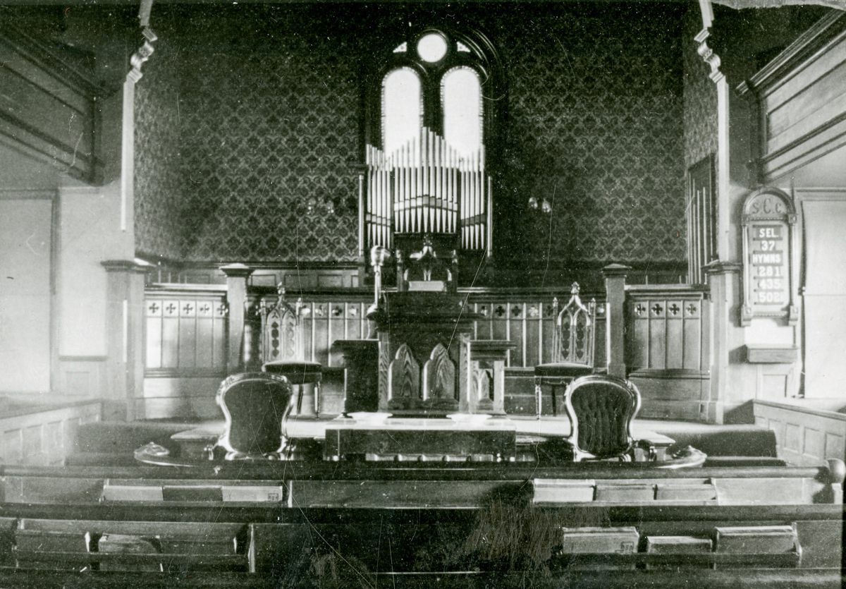 Interior of Stanwich Congregational Church, looking towards the altar.