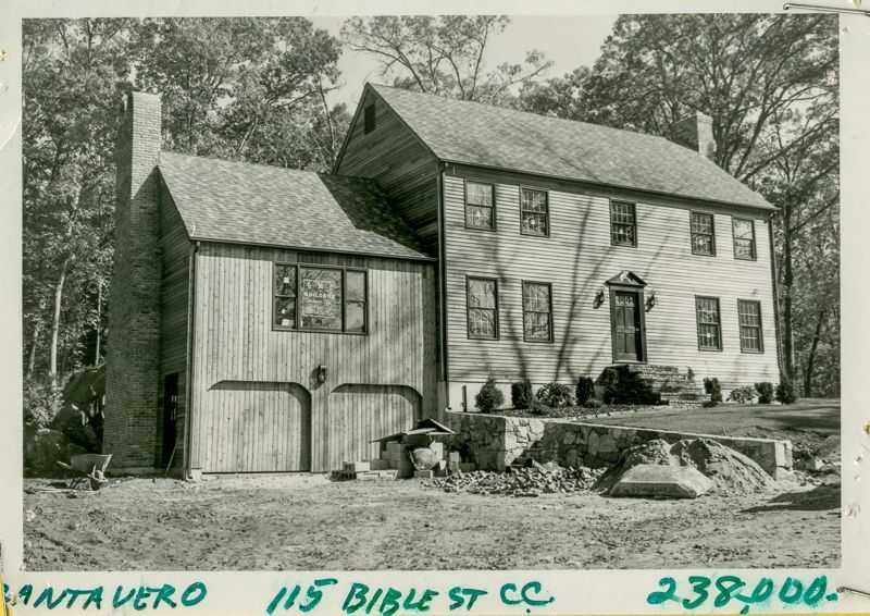 Wooden house built in 1978 with a two door garage viewed from its not-yet-finished driveway.