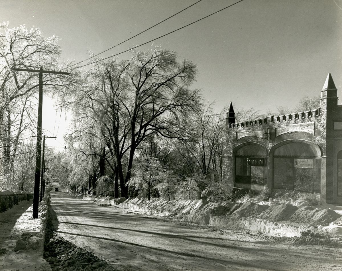 Looking south down from the corner of Milbank Avenue and East Putnam Avenue after an ice storm in December 1947.