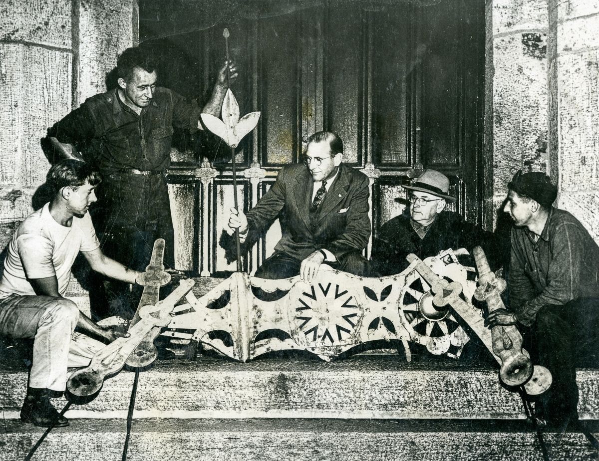 Reverend Daniel Bliss, pastor of Second Congregational Church, and other men posing with the weathervane of Second Congregational Church.Collection