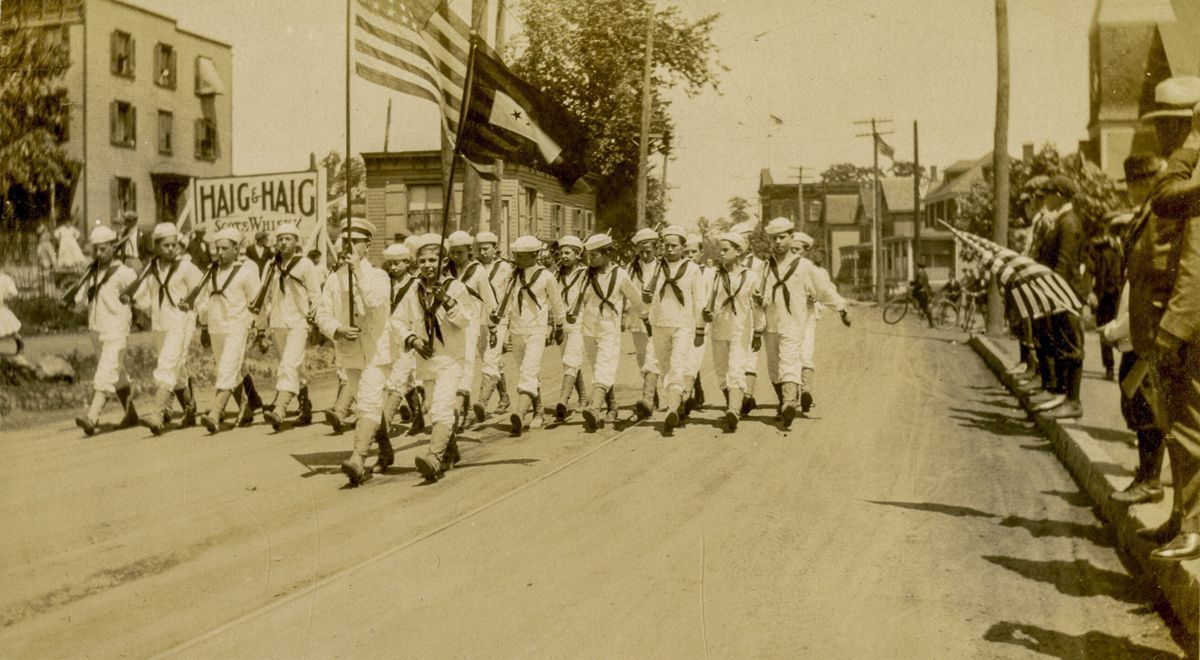 Boys in the Naval Sea Cadet Corps marching in a parade along Delavan Avenue in Byram; note that they are carrying a Blue Star Service Flag that had only been created the year prior.Collection