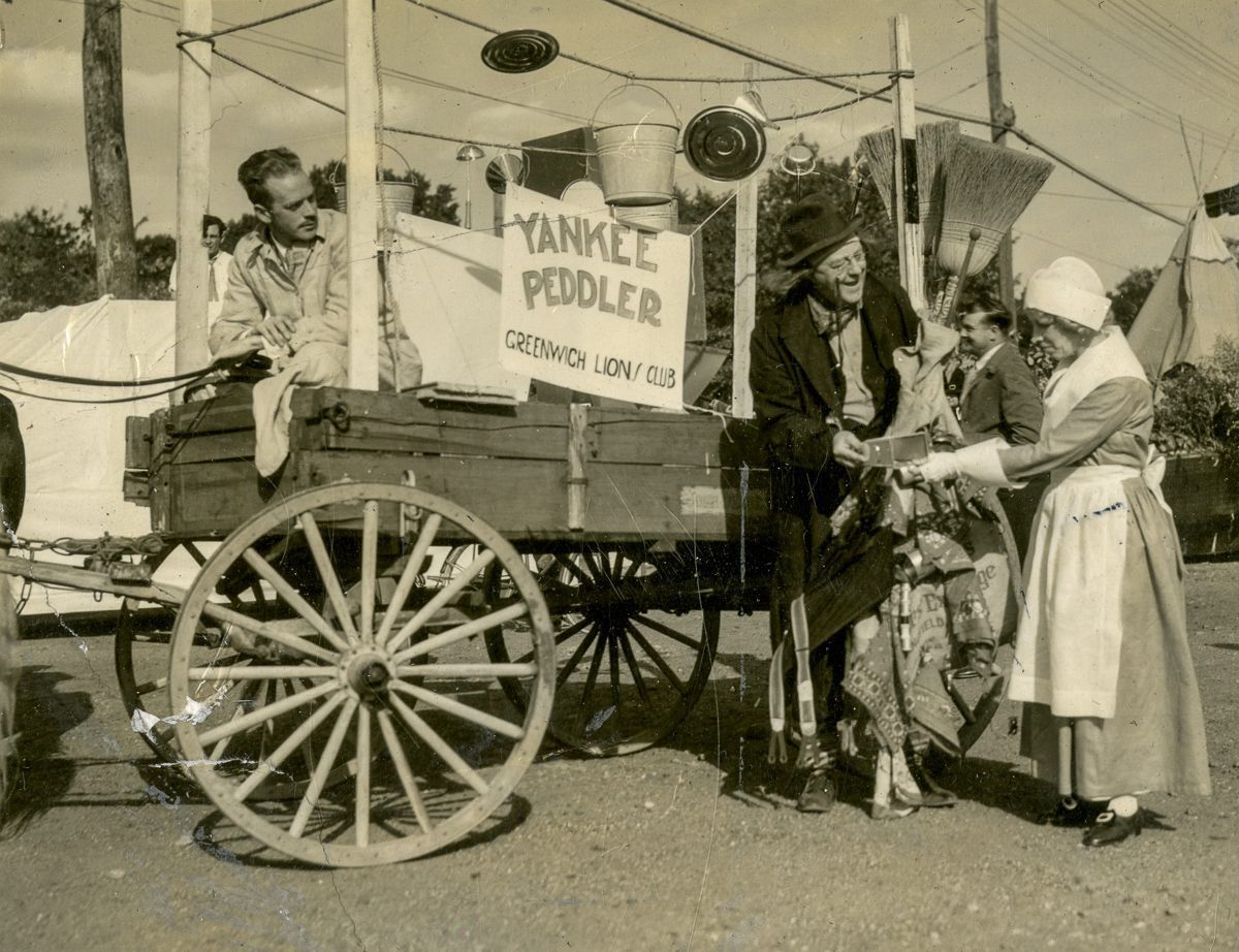 The Greenwich Lion's Club wagon/float for the Connecticut Tercentenary portraying a "Yankee Peddler" selling home goods to a woman in Colonial costume.Collection