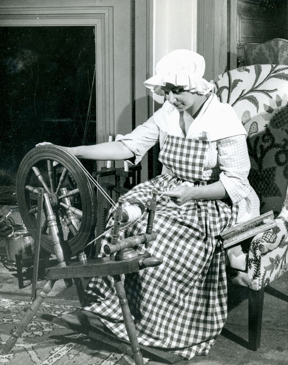 A Junior League guide in period costume demonstrating the use of a spinning wheel.
