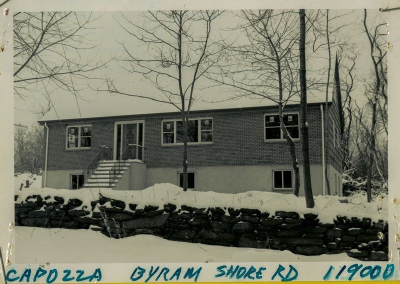 Ranch house built in 1976 with brick and concrete walls in the snow.