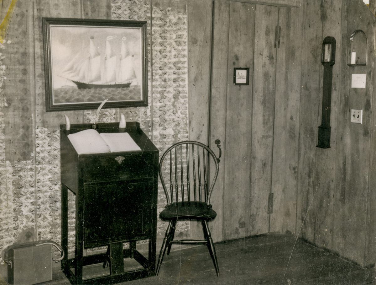 A writing desk, painting of a boat, and a chair in the room now known as "Sarah's Sickroom."