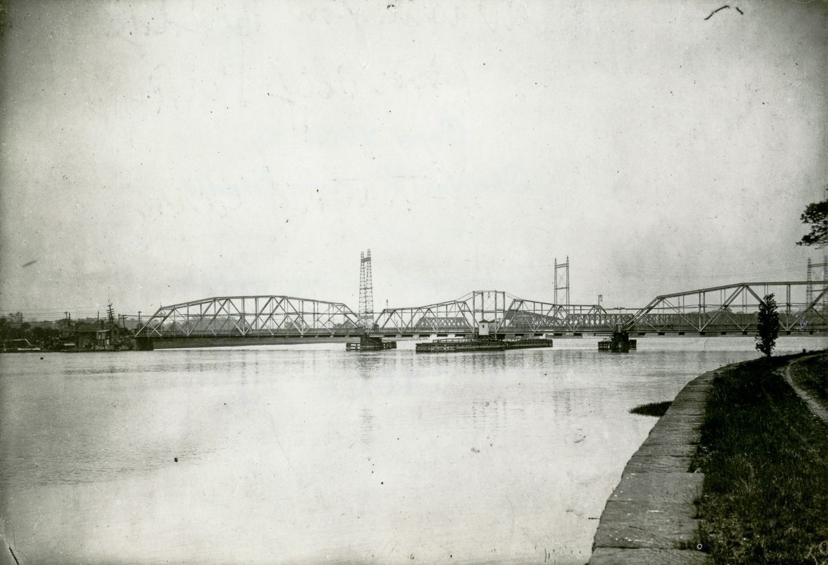 The original bridge across the Housatonic River connecting Milford and Stratford prior to its demolition in 1894 and a section of it being brought to Riverside to be used to cross the railroad tracks at Riverside Station.Collection
