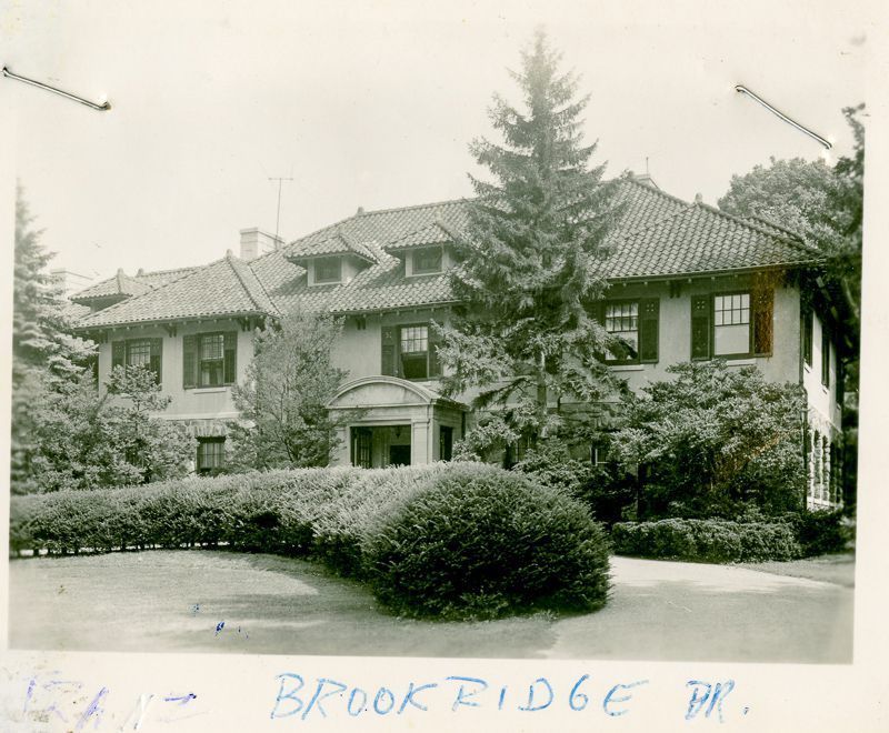 Mediterranean-style house built in 1932 with stucco walls and a tile roof viewed from its driveway.Collection