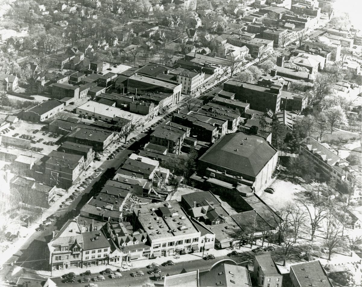 Aerial view looking south-west from the Post Road down Greenwich Avenue.