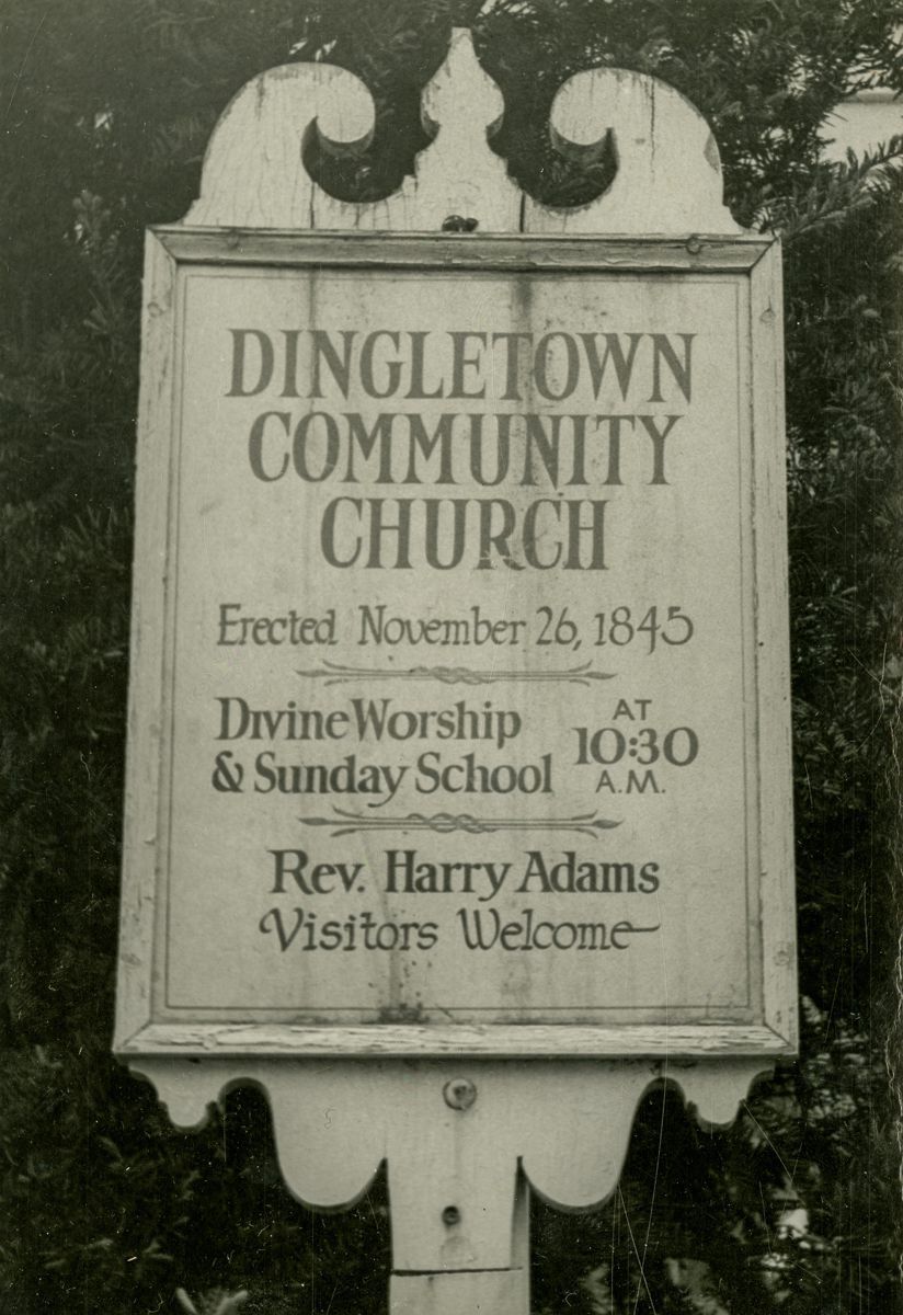 The sign standing outside Dingletown Community Church that reads: "Dingletown/ Community/ Church/ Erected November 26,1 1845/ Divine Worship & Sunday School/ At 10:30 AM/ Rev. Harry Adams/ Visitors Welcome"Collection