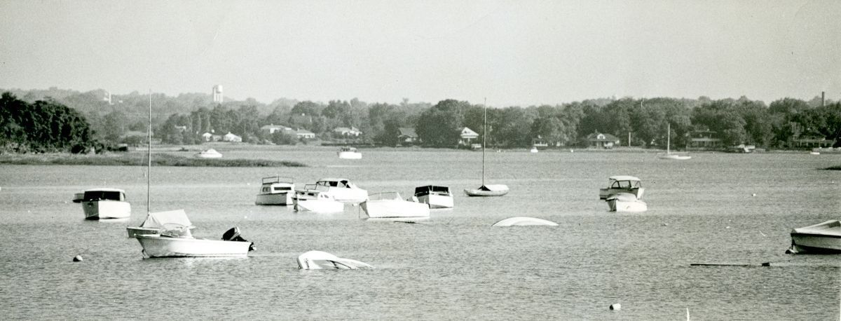 Boats at anchor off of Tod's Point, several of which are capsized after a storm.