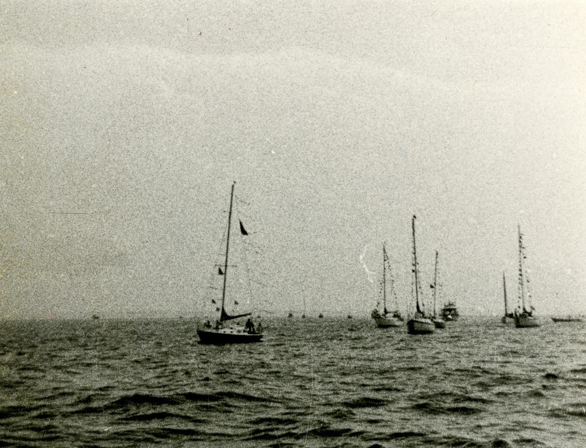 Sailboats with their sails down and signal flags on their lines sailing together on the Sound.