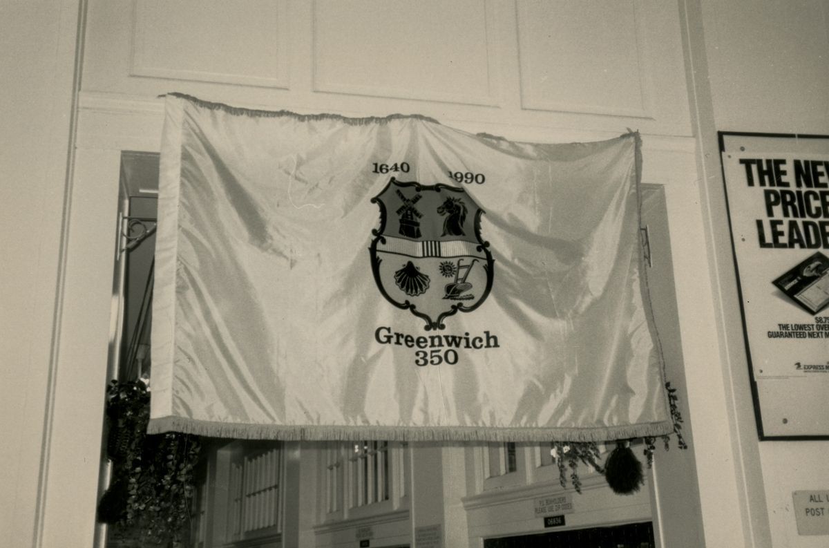 A flag with the coat of arms of Greenwich commemorating the 350th Anniversary of Greenwich's founding.