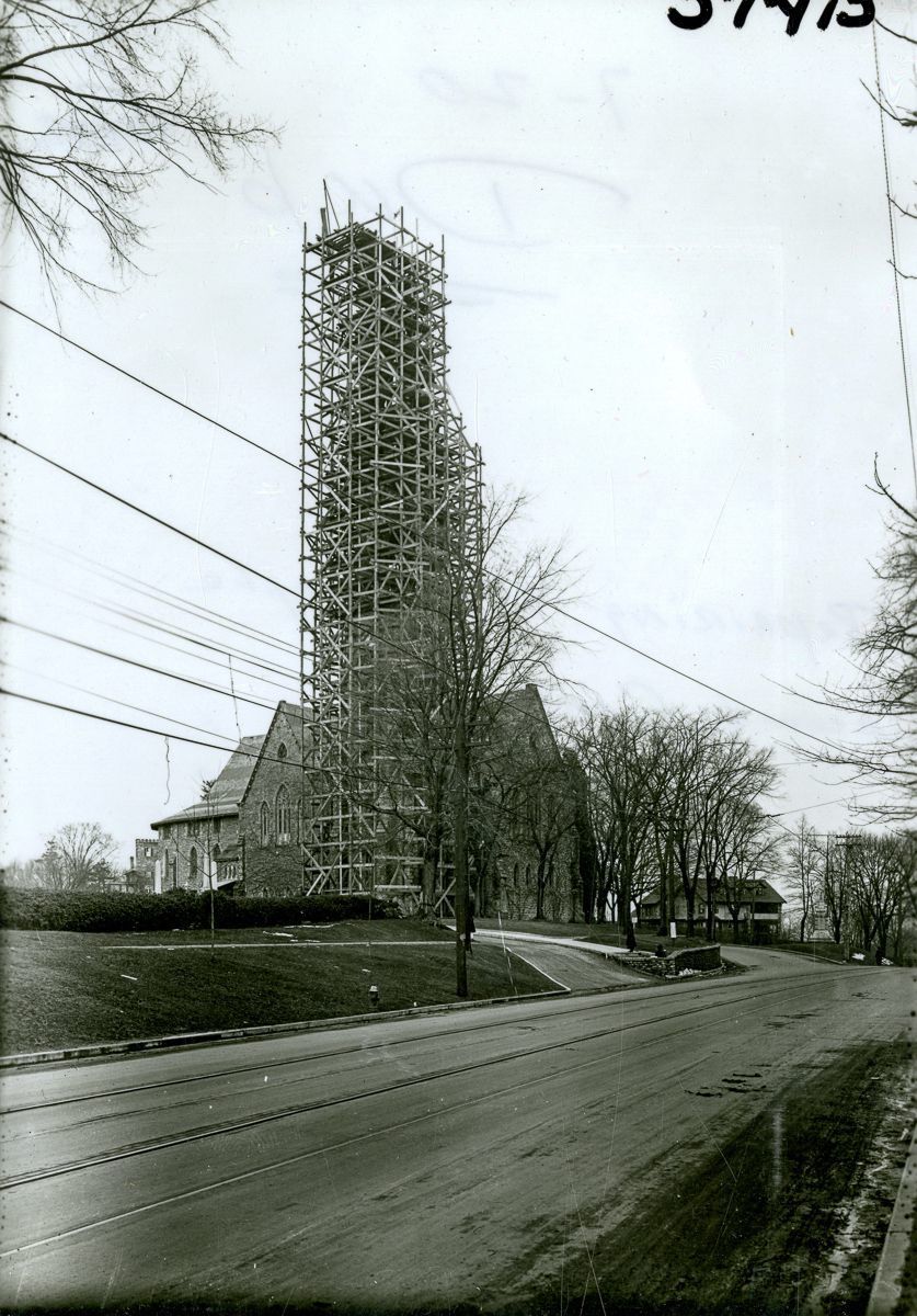 A view of the Second Congregational Church from East Putnam Avenue, with the steeple surrounded by scaffolding during repairs.Collection