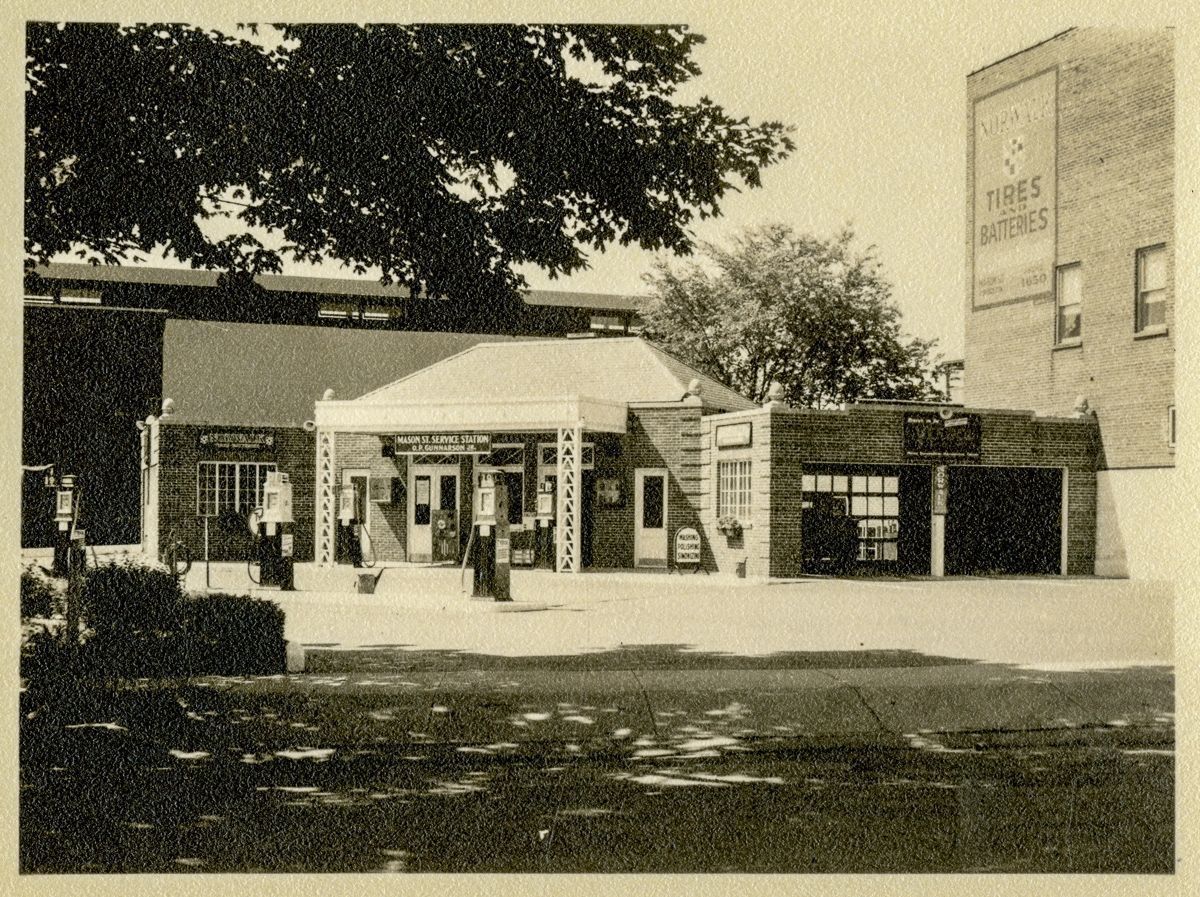 View of a service station located at the corner/intersection of Mason Street and Havemeyer Place with an advertisement for Norwalk Tires and Batteries on the building on the left of the image.Collection