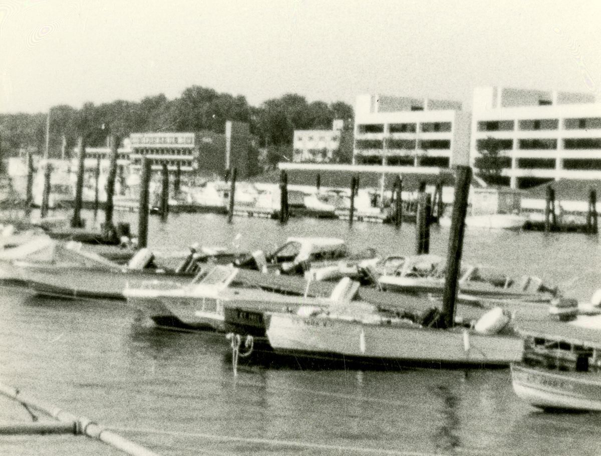 Boats moored in Greenwich Harbor looking towards Steamboat Road.