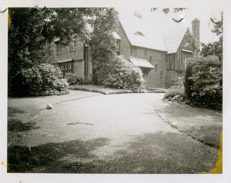 English-style house with brick walls and a slate roof viewed from its driveway.