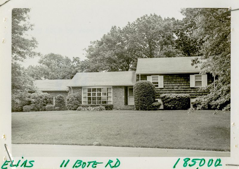 Split level house with a shingled wing and two brick wings, built in 1959 and viewed from the street.