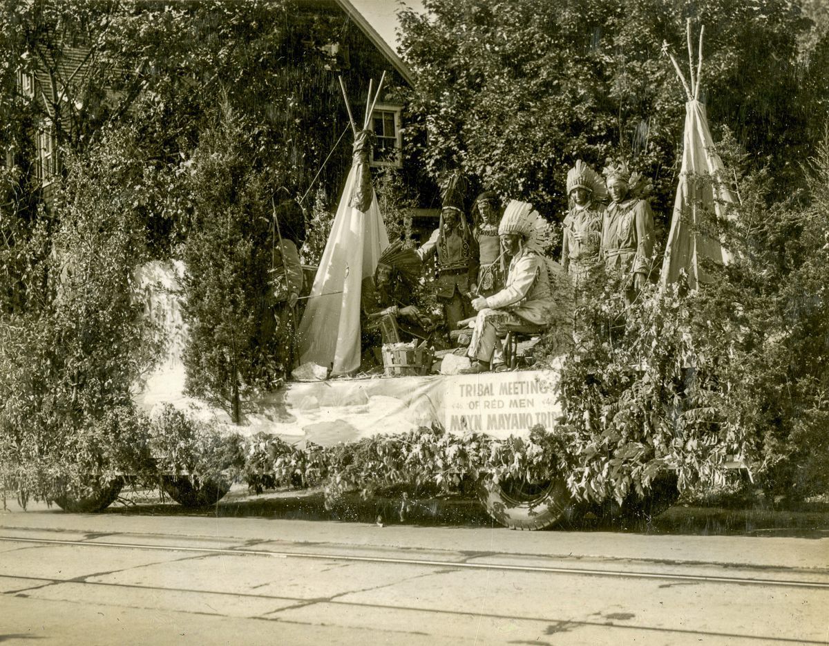 A group of members of the Improved Order of Red Men, specifically the Greenwich chapter named the 'Mayn Mayano Tribe' after a Siwanoy chief who was killed in a fight with colonists during the 1640's, on their association's float during the Connecticut Tercentenary.Collection
