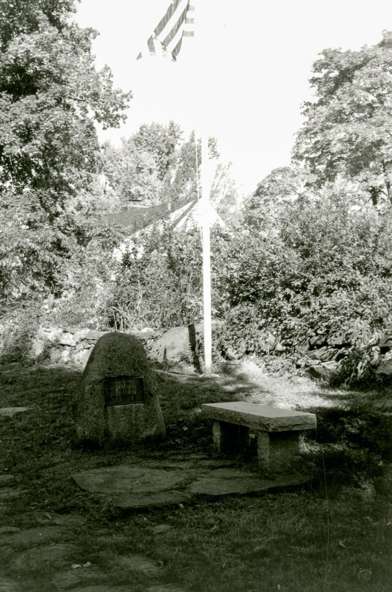 The monument to the First Settlement of Greenwich and a stolen bench in Tomac Cemetery.