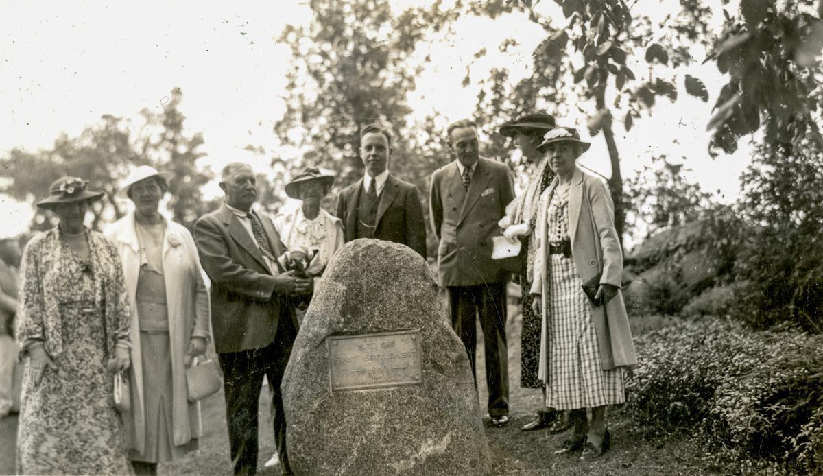 People posing around a stone with a plaque commemorating the first settlement of Greenwich.Collection