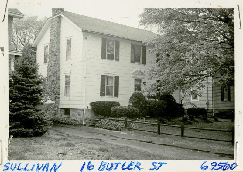 Two story house built in the 1930's with a jerkinhead roof viewed from the street.