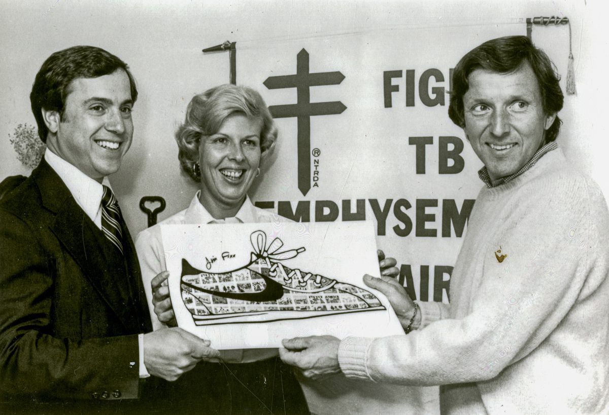 Jim Fixx, author of "The Complete Book of Running" and Christmas Seal Chairman of the Connecticut Lung Association, Fairfield County Branch, being awarded a 'running shoe' made of Christmas Seals by Daniel Gewant and Nancy Root.Collection