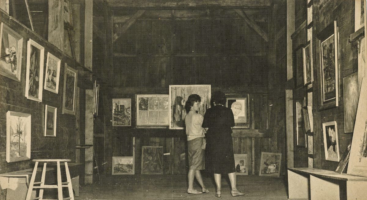 Two women viewing paintings in an exhibition at the Greenwich Art Barn.