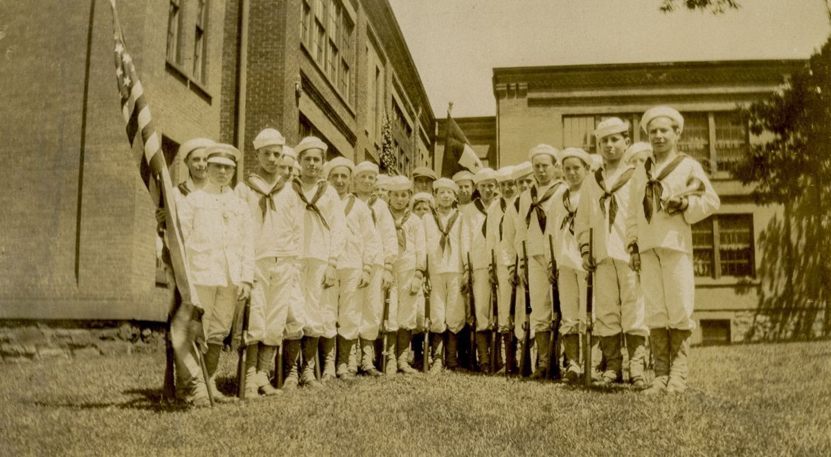 Boys in the Naval Sea Cadet Corps posing in front of the former site of New Lebanon School after participating in a parade.Collection