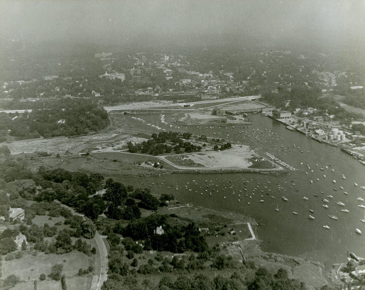 Aerial view of Grass Island and Greenwich harbor facing north.