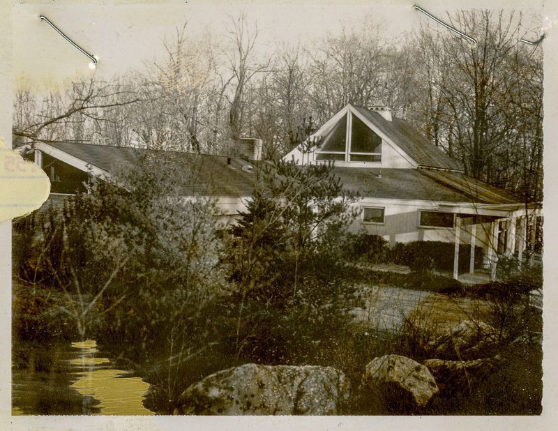 Contemporary house built circa 1960 with a combination roof viewed from the street.