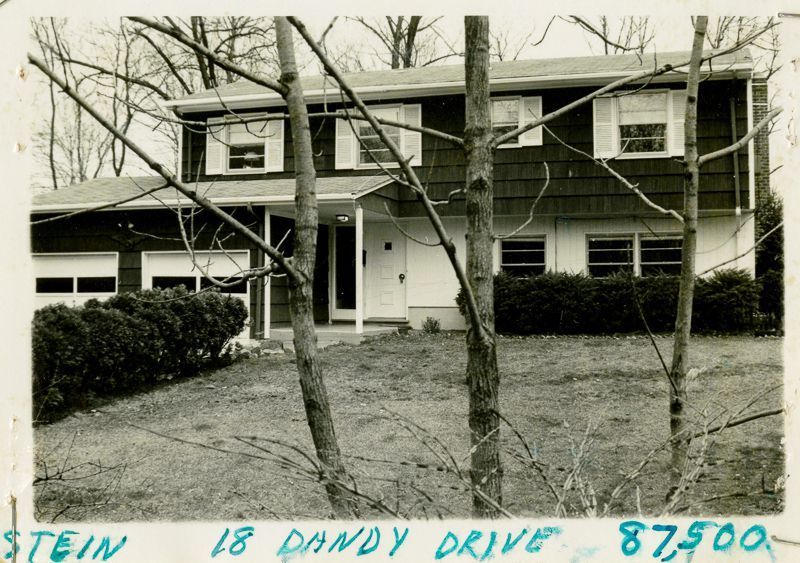 Split-level house built in 1958 with a two door garage viewed from its lawn.