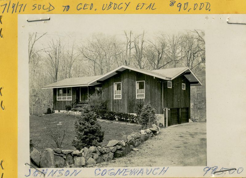 Contemporary house built in 1965 with cedar siding and a two door garage viewed from its driveway.Collection