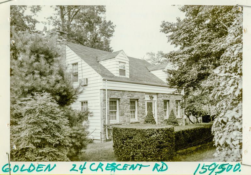 Colonial-style house built in 1941 with additions from 1969 with stone and aluminum siding, viewed from its lawn.Collection