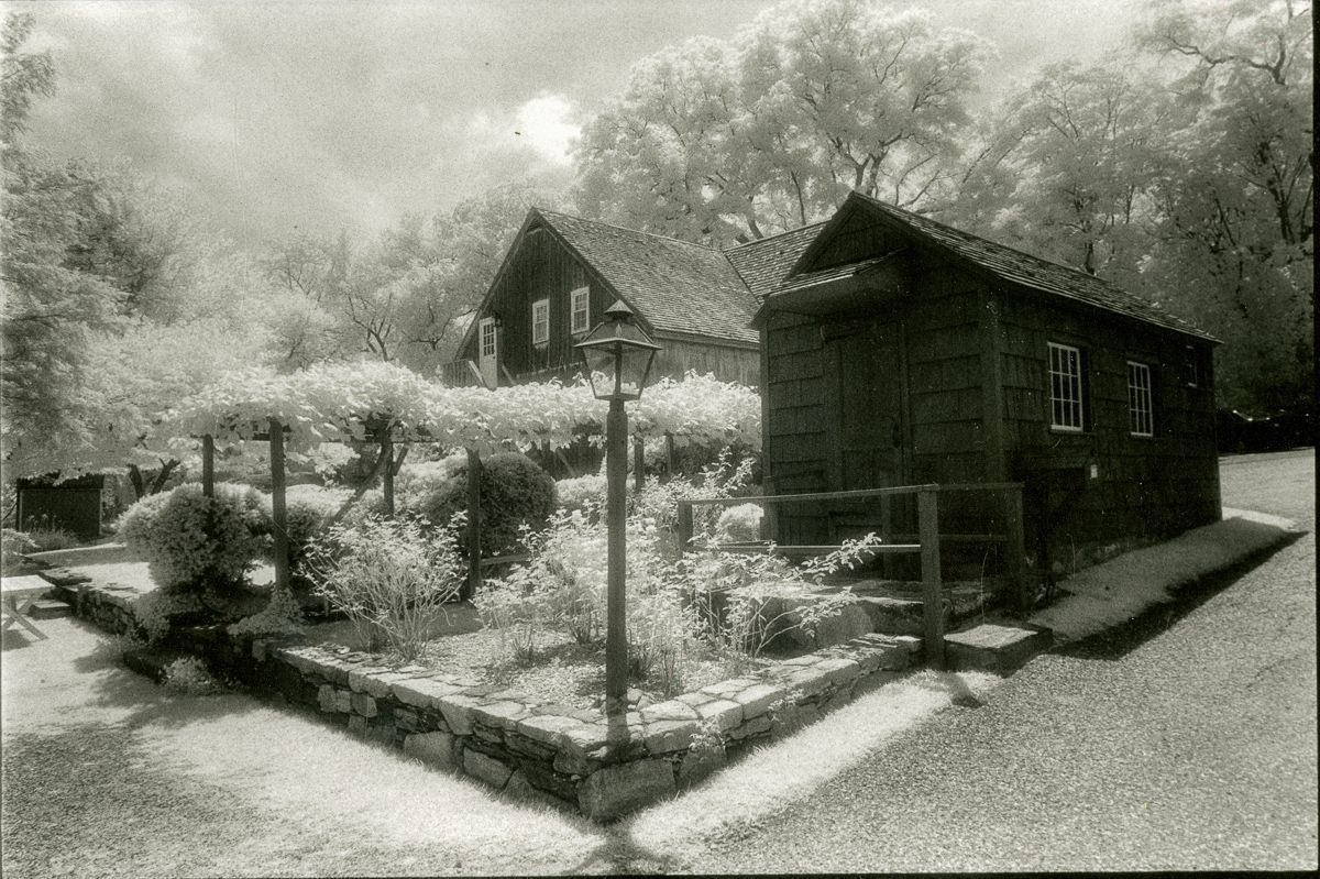 The old archives building, grape arbor, and shed behind the Bush-Holley House.