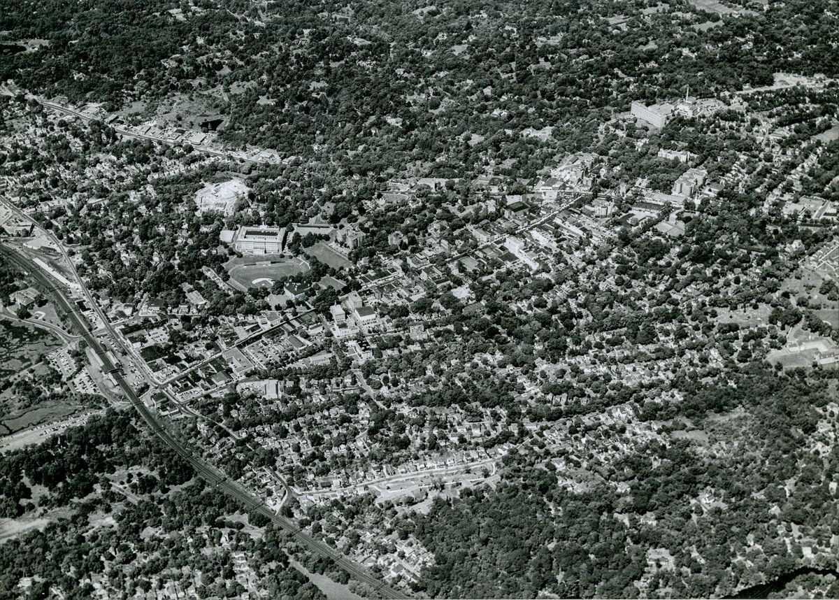 Aerial view of Central Greenwich looking south-west along the railroad.Collection