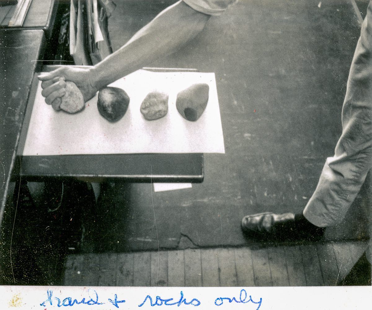 Four "Indian pounding stones" and the hand of a man demonstrating how to hold one.